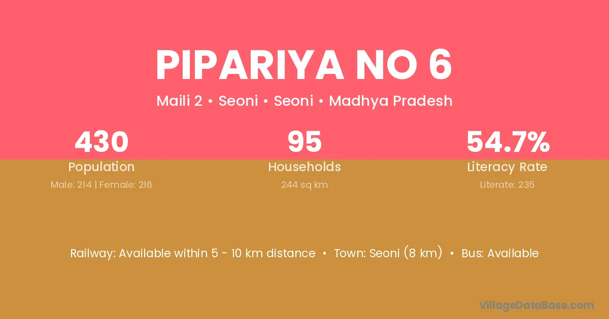 Seoni (8 km) is the nearest town to Pipariya No 6 village for major economic activities and is located approximately 8 km away.