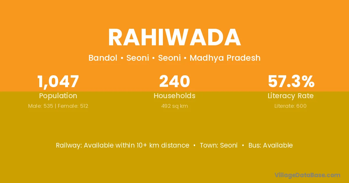 Rahiwada village has a total population of 1,047 people, of which 535 are males and 512 are females.