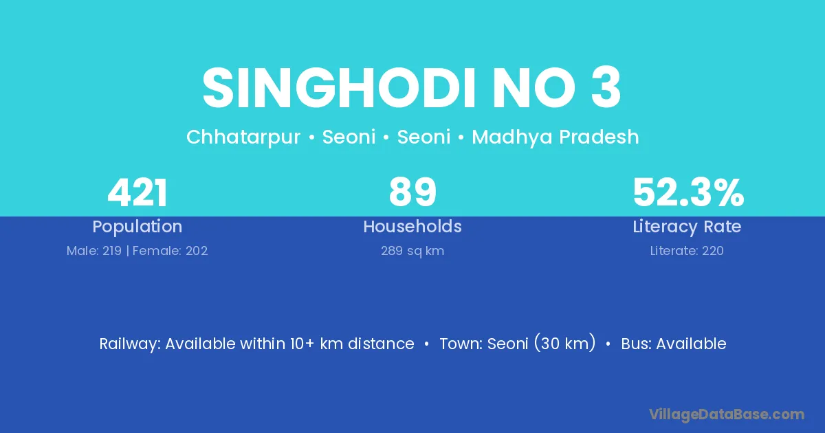 Seoni (30 km) is the nearest town to Singhodi No 3 village for major economic activities and is located approximately 30 km away.