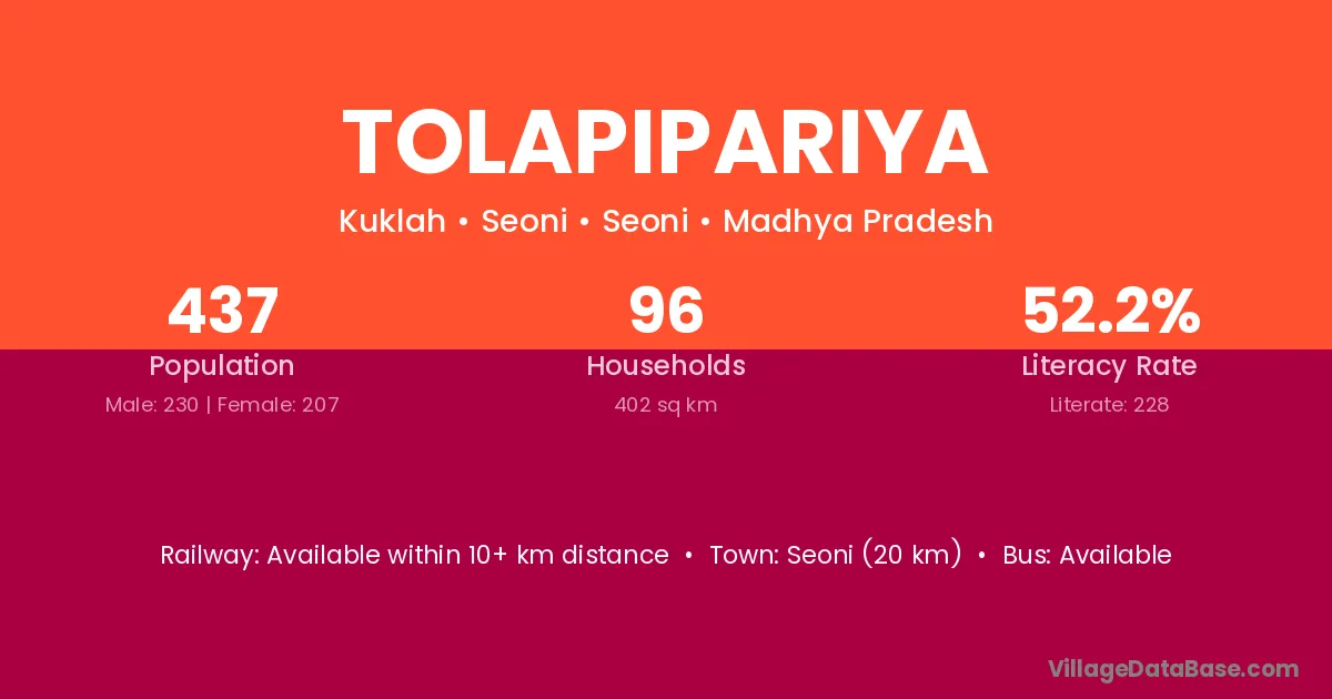Seoni (20 km) is the nearest town to Tolapipariya village for major economic activities and is located approximately 20 km away.