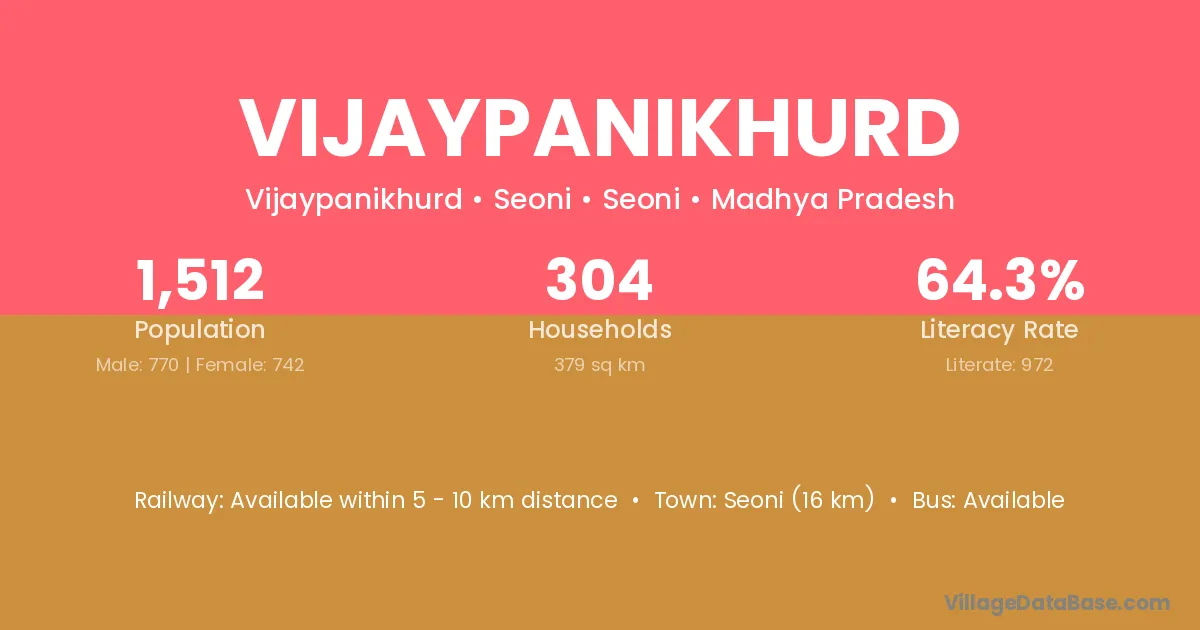 Seoni (16 km) is the nearest town to Vijaypanikhurd village for major economic activities and is located approximately 16 km away.