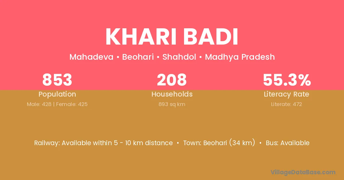 Beohari (34 km) is the nearest town to Khari Badi village for major economic activities and is located approximately 34 km away.