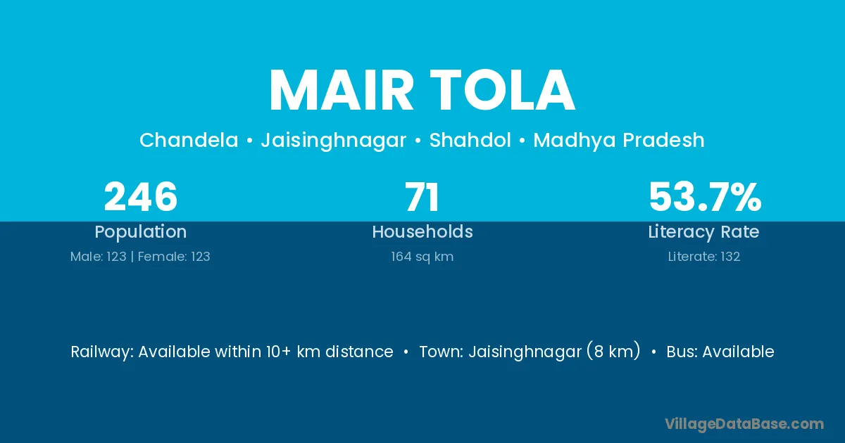 Beohari (4 km) is the nearest town to Mair Tola village for major economic activities and is located approximately 4 km away.