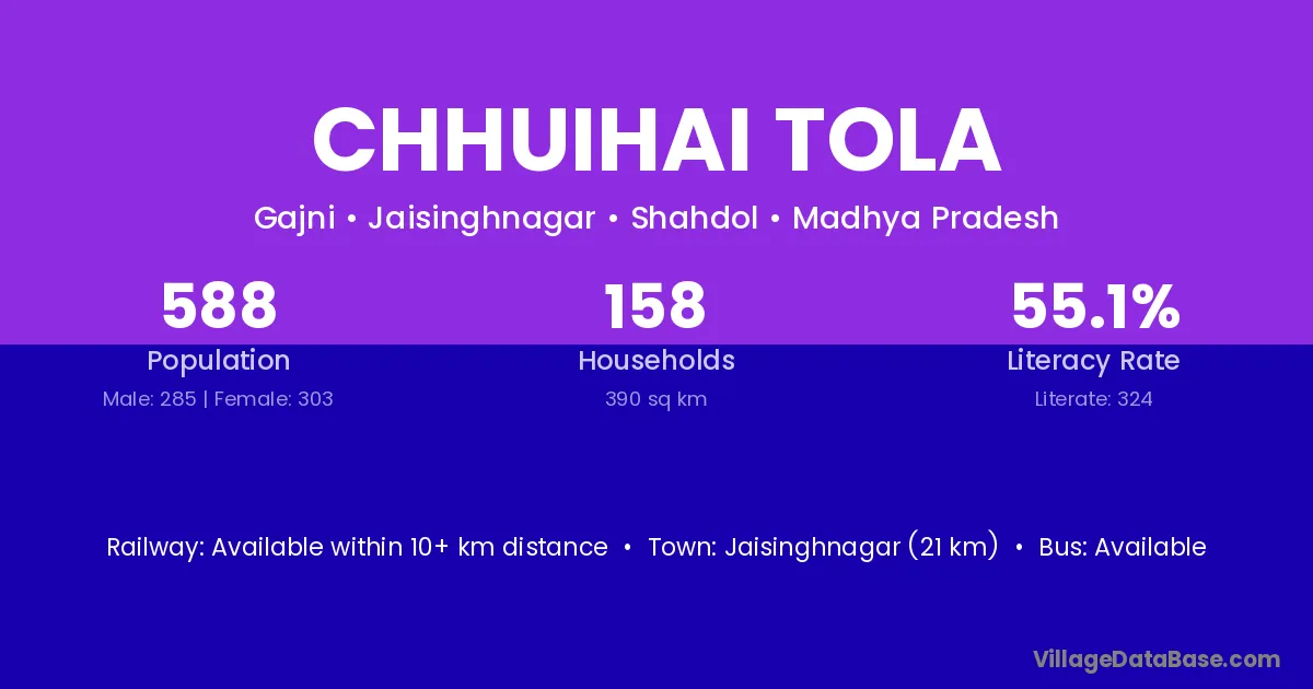 Chhuihai Tola village has a total population of 588 people, of which 285 are males and 303 are females.