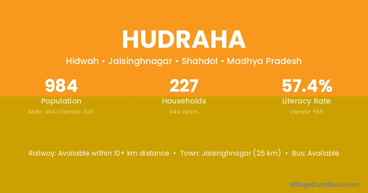 Jaisinghnagar (25 km) is the nearest town to Hudraha village for major economic activities and is located approximately 25 km away.