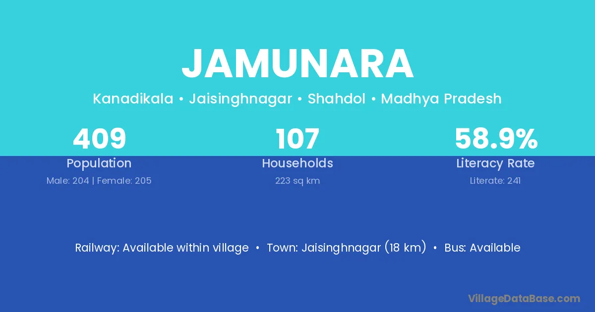 Jamunara village has a total population of 409 people, of which 204 are males and 205 are females.
