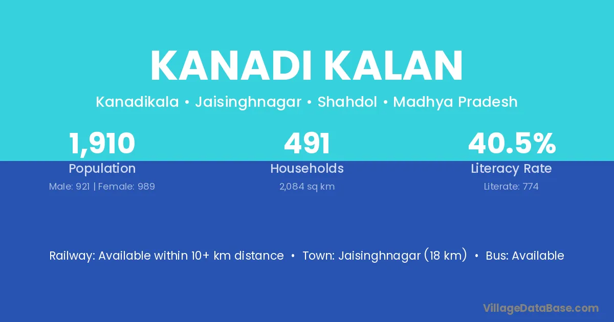 Kanadi Kalan village has a total population of 1,910 people, of which 921 are males and 989 are females.