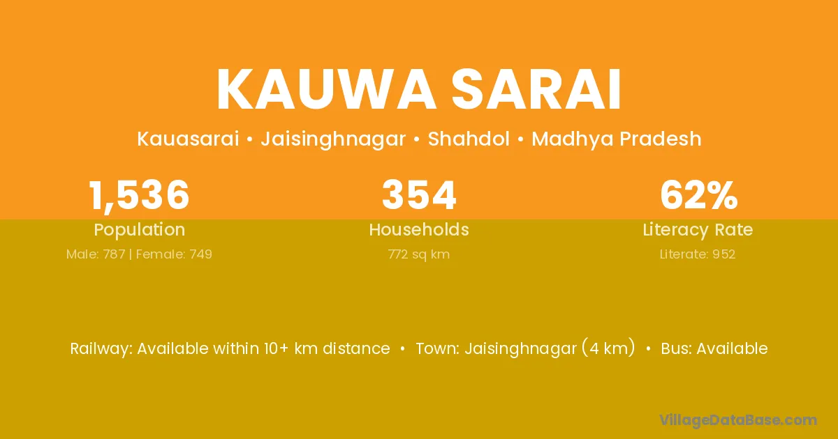 Kauwa Sarai village has a total population of 1,536 people, of which 787 are males and 749 are females.