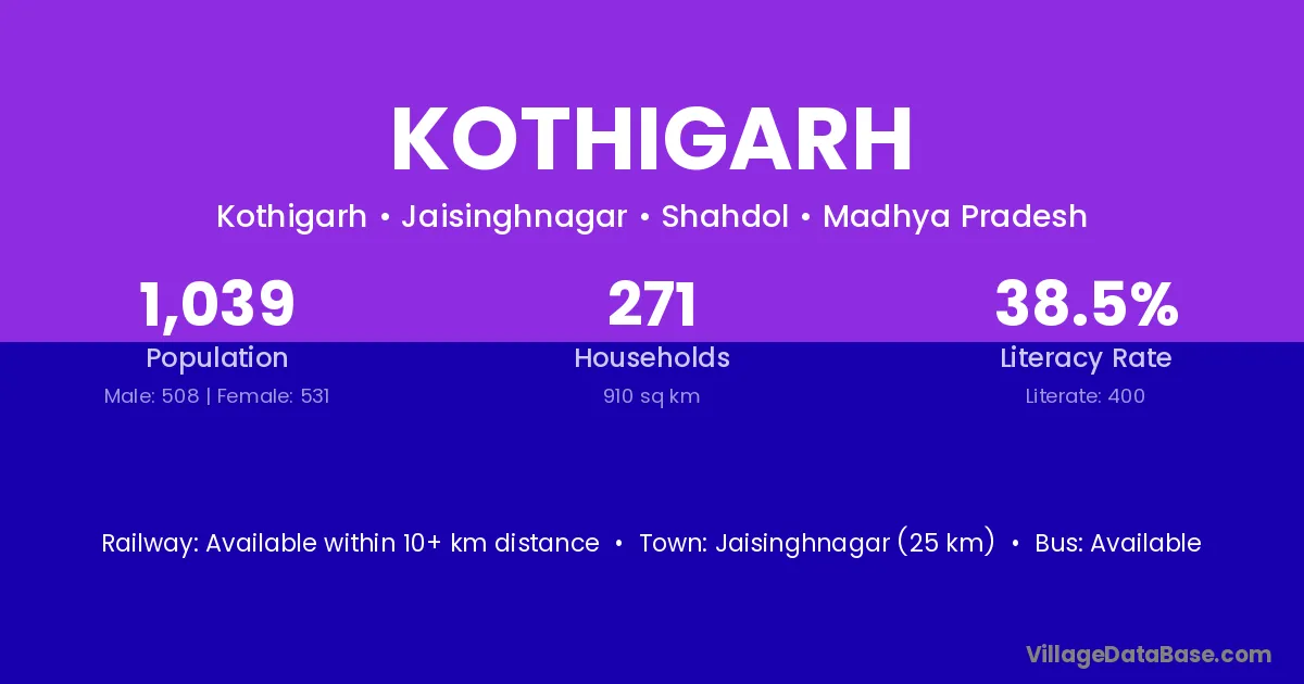 Kothigarh village has a total population of 1,039 people, of which 508 are males and 531 are females.