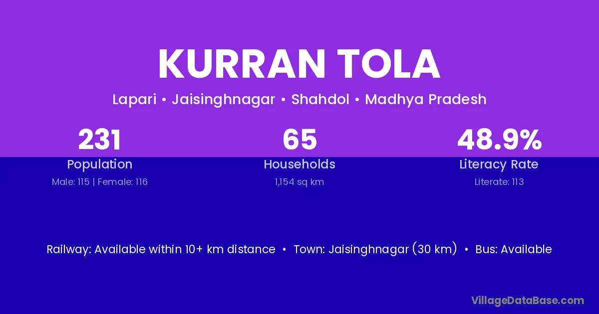 Jaisinghnagar (30 km) is the nearest town to Kurran Tola village for major economic activities and is located approximately 30 km away.