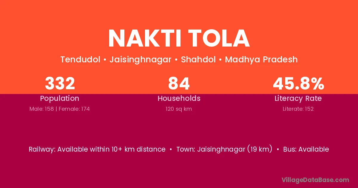 Nakti Tola village has a total population of 332 people, of which 158 are males and 174 are females.