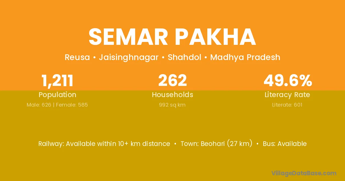 Beohari (27 km) is the nearest town to Semar Pakha village for major economic activities and is located approximately 27 km away.