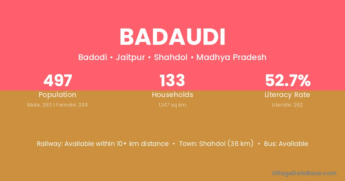Shahdol (36 km) is the nearest town to Badaudi village for major economic activities and is located approximately 36 km away.