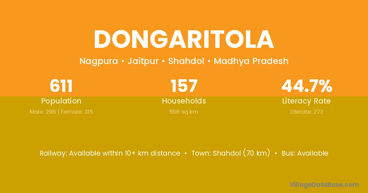 Shahdol (70 km) is the nearest town to Dongaritola village for major economic activities and is located approximately 70 km away.