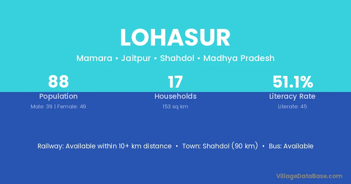 Shahdol (90 km) is the nearest town to Lohasur village for major economic activities and is located approximately 90 km away.