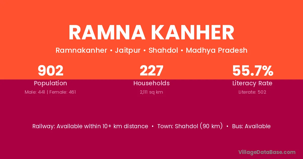 Shahdol (90 km) is the nearest town to Ramna Kanher village for major economic activities and is located approximately 90 km away.