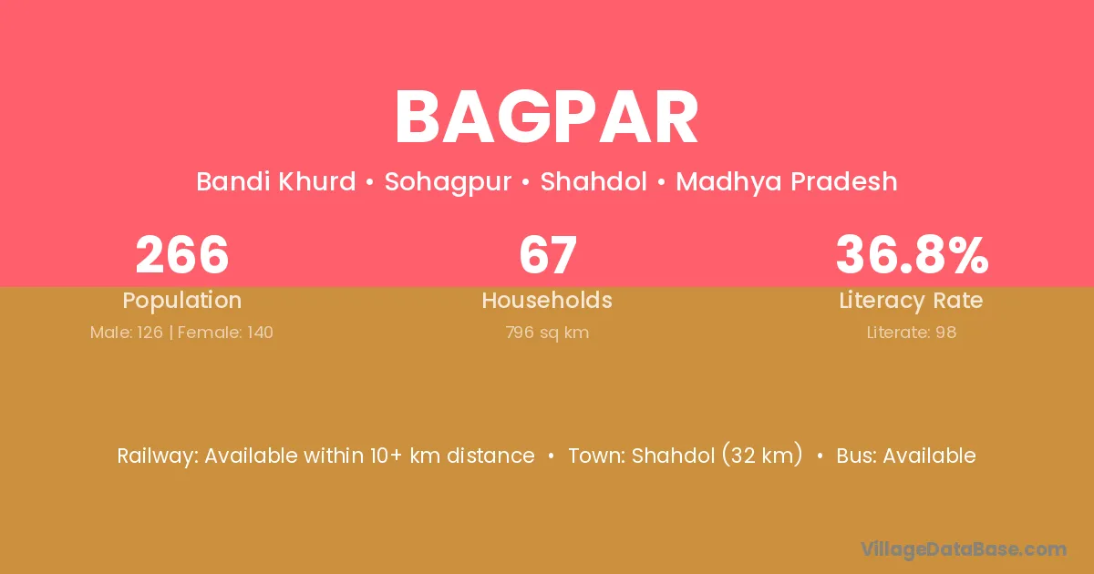 Shahdol (32 km) is the nearest town to Bagpar village for major economic activities and is located approximately 32 km away.