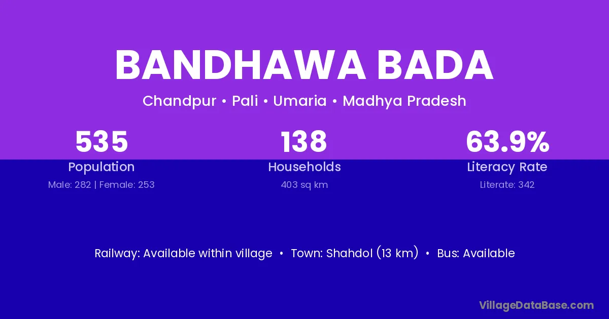 Shahdol (20 km) is the nearest town to Bandhawa Bada village for major economic activities and is located approximately 20 km away.