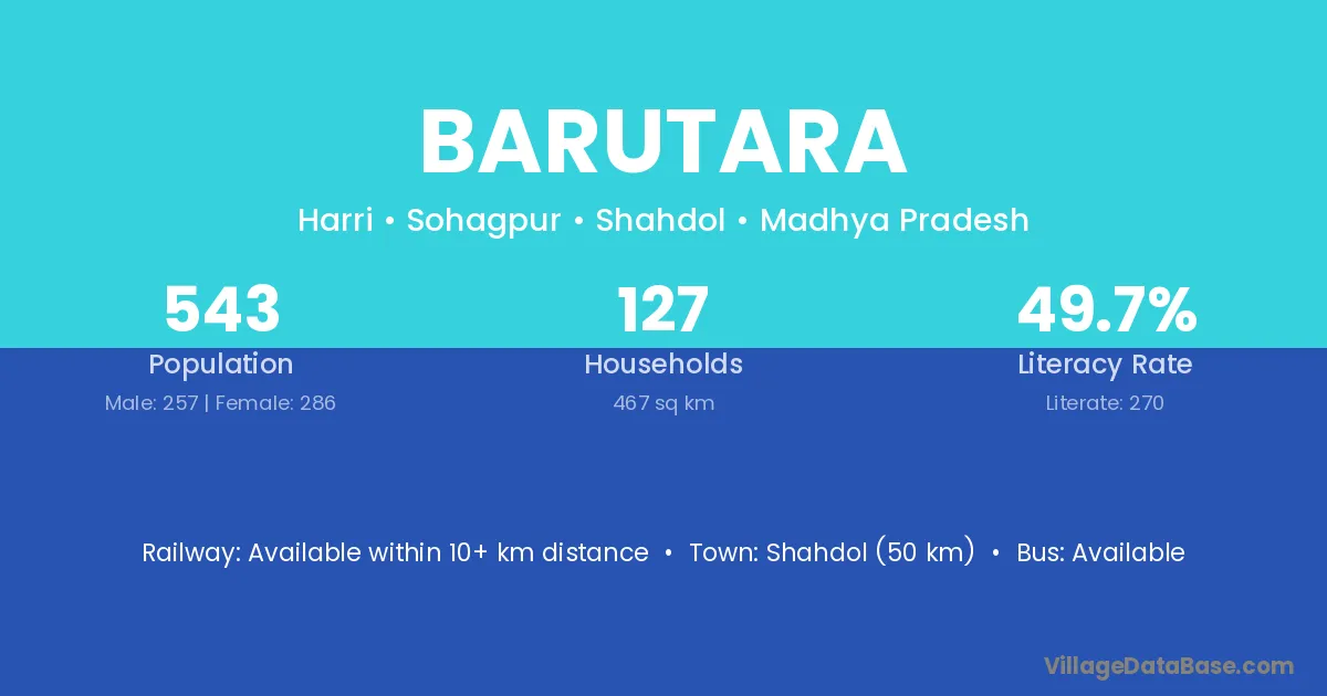 Shahdol (50 km) is the nearest town to Barutara village for major economic activities and is located approximately 50 km away.