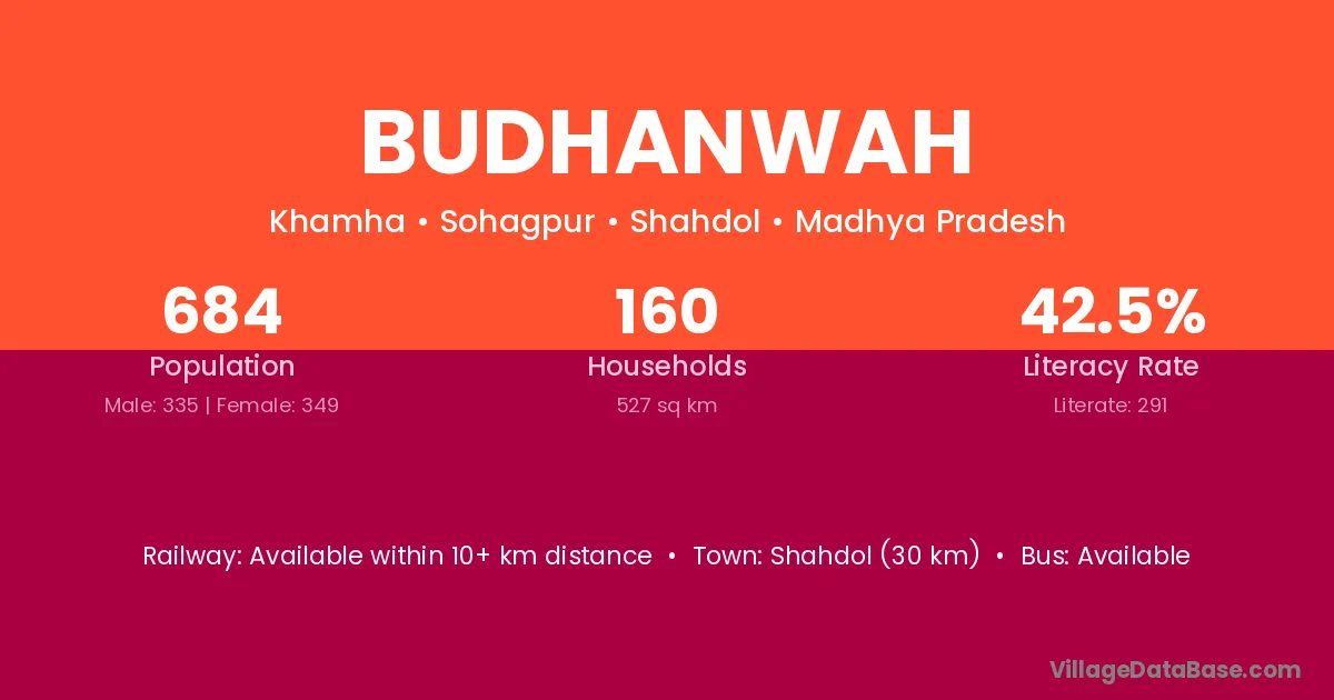 Shahdol (30 km) is the nearest town to Budhanwah village for major economic activities and is located approximately 30 km away.