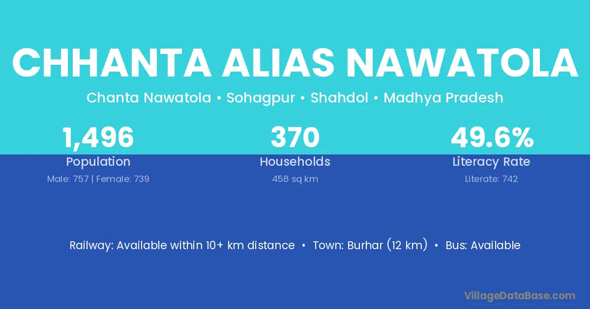 Burhar (12 km) is the nearest town to Chhanta Alias Nawatola village for major economic activities and is located approximately 12 km away.