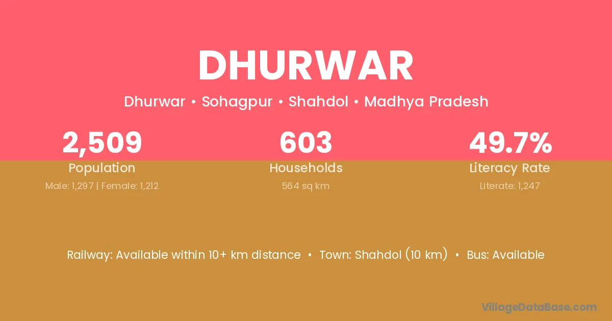 Shahdol (10 km) is the nearest town to Dhurwar village for major economic activities and is located approximately 10 km away.