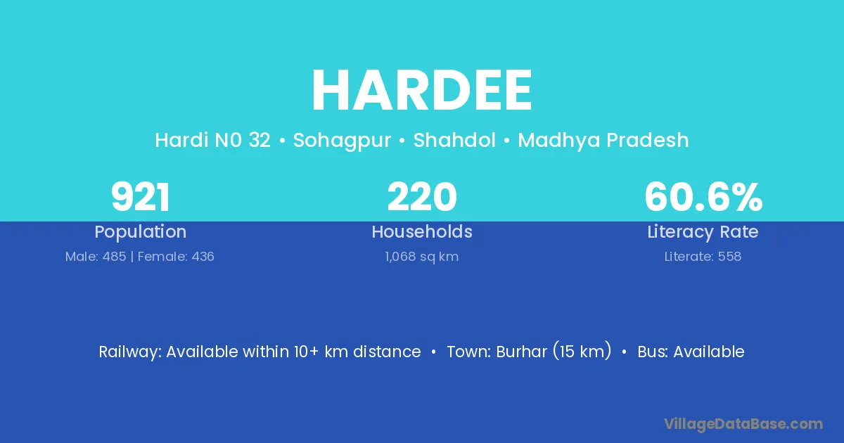 Burhar (15 km) is the nearest town to Hardee village for major economic activities and is located approximately 15 km away.
