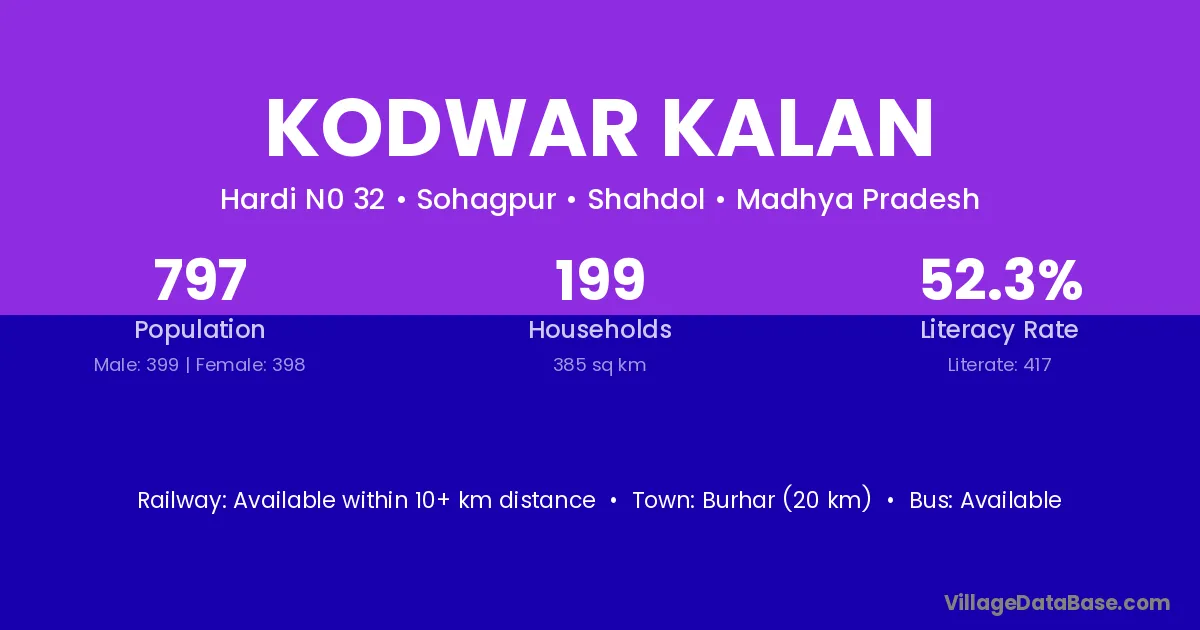 Burhar (20 km) is the nearest town to Kodwar Kalan village for major economic activities and is located approximately 20 km away.