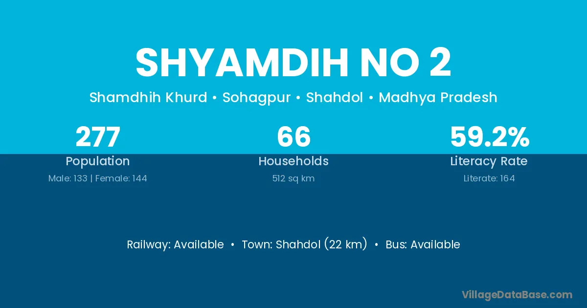 Shahdol (22 km) is the nearest town to Shyamdih No 2 village for major economic activities and is located approximately 22 km away.