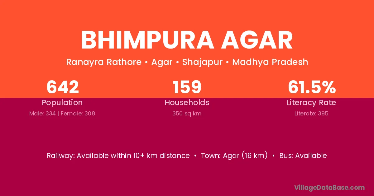 Agar (16 km) is the nearest town to Bhimpura Agar village for major economic activities and is located approximately 16 km away.