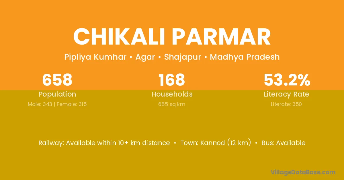 Kannod (12 km) is the nearest town to Chikali Parmar village for major economic activities and is located approximately 12 km away.
