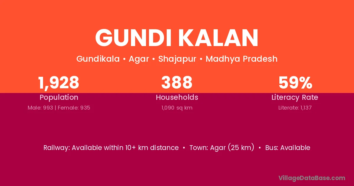 Agar (25 km) is the nearest town to Gundi Kalan village for major economic activities and is located approximately 25 km away.