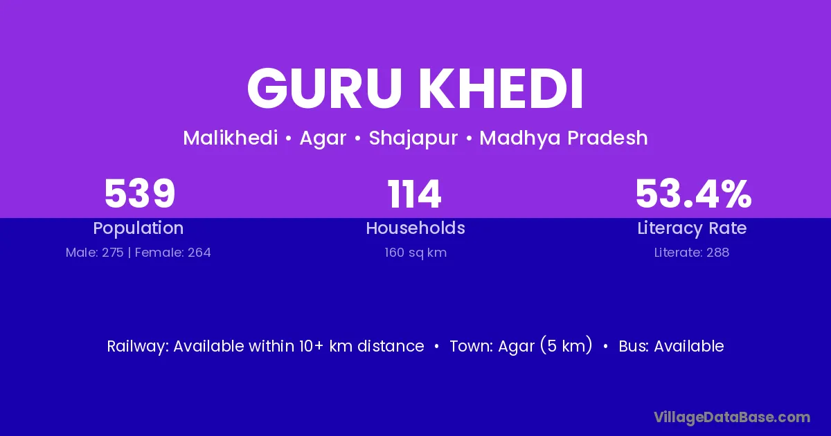Agar (5 km) is the nearest town to Guru Khedi village for major economic activities and is located approximately 5 km away.