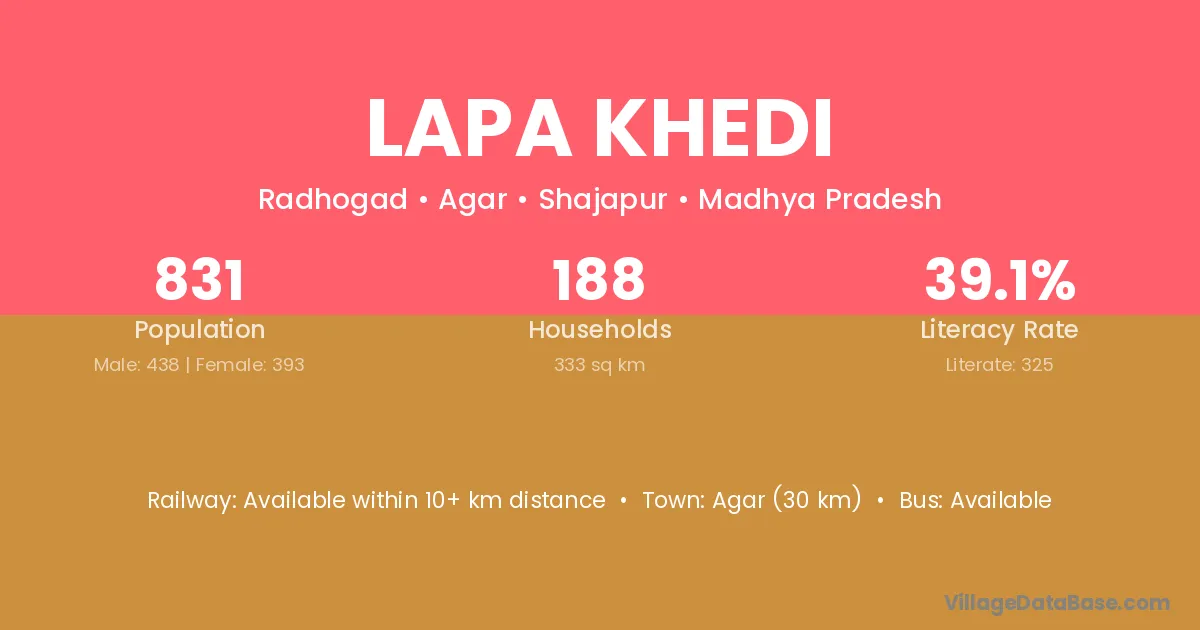Lapa Khedi village has a total population of 831 people, of which 438 are males and 393 are females.
