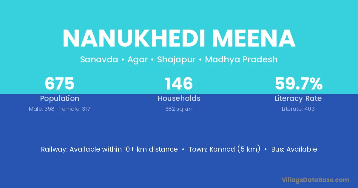 Kannod (5 km) is the nearest town to Nanukhedi Meena village for major economic activities and is located approximately 5 km away.