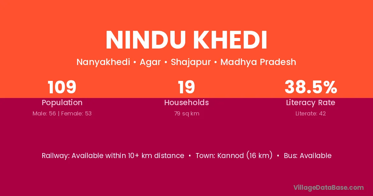 Nindu Khedi village has a total population of 109 people, of which 56 are males and 53 are females.