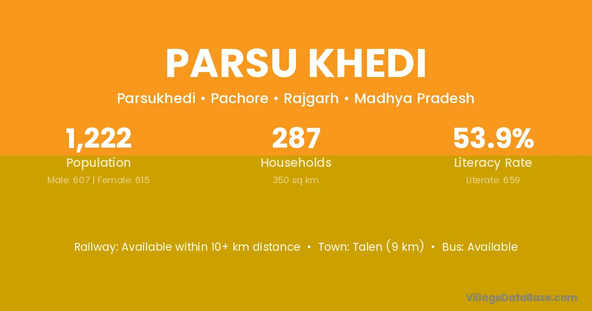 The literacy rate of Parsu Khedi village is 48.14%. Male literacy stands at 63.22% and female literacy at 32.45%.
