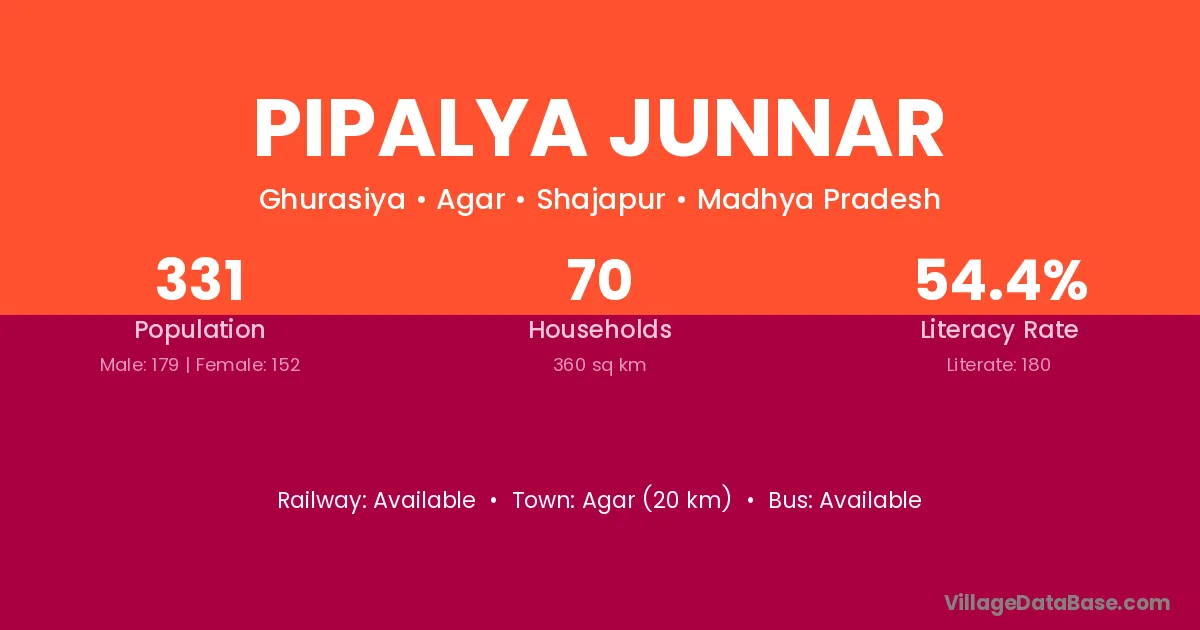 Agar (20 km) is the nearest town to Pipalya Junnar village for major economic activities and is located approximately 20 km away.