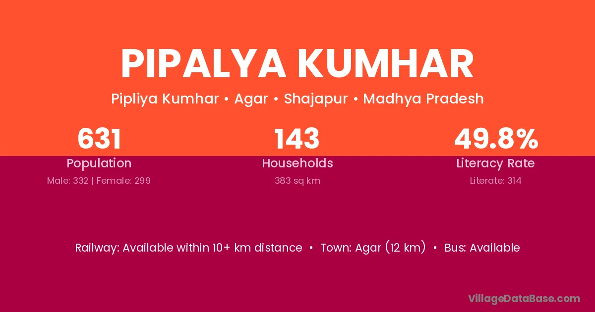 Agar (12 km) is the nearest town to Pipalya Kumhar village for major economic activities and is located approximately 12 km away.