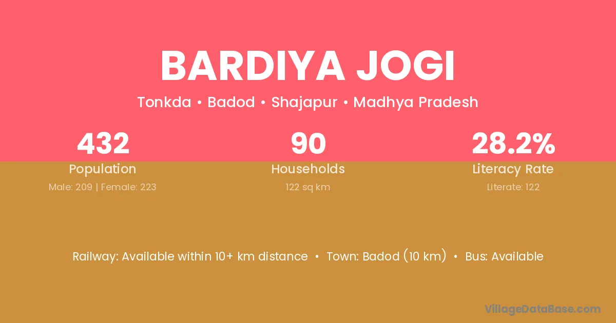 Bardiya Jogi village has a total population of 432 people, of which 209 are males and 223 are females.