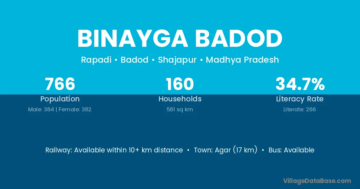 Agar (17 km) is the nearest town to Binayga Badod village for major economic activities and is located approximately 17 km away.