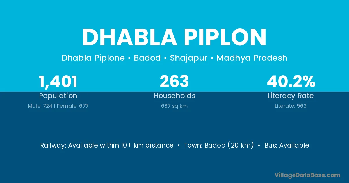 Badod (20 km) is the nearest town to Dhabla Piplon village for major economic activities and is located approximately 20 km away.