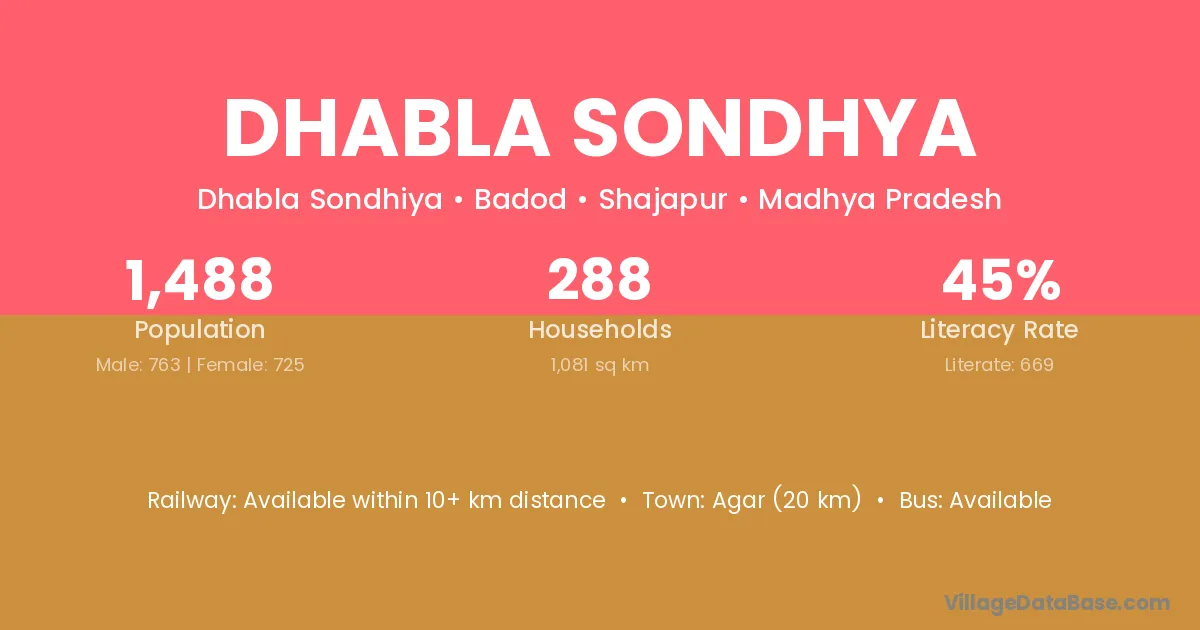 Agar (20 km) is the nearest town to Dhabla Sondhya village for major economic activities and is located approximately 20 km away.