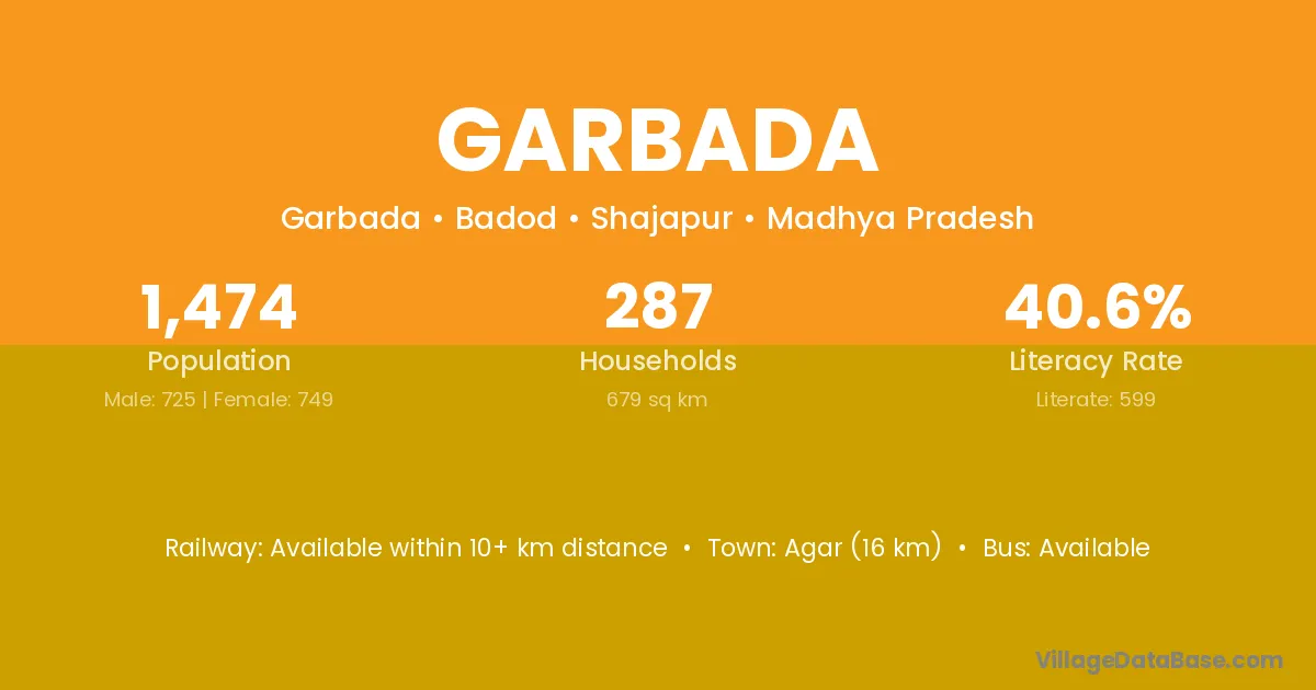 Agar (16 km) is the nearest town to Garbada village for major economic activities and is located approximately 16 km away.