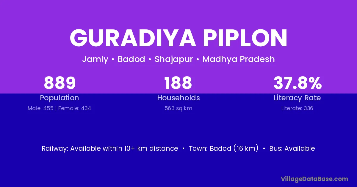 Badod (16 km) is the nearest town to Guradiya Piplon village for major economic activities and is located approximately 16 km away.
