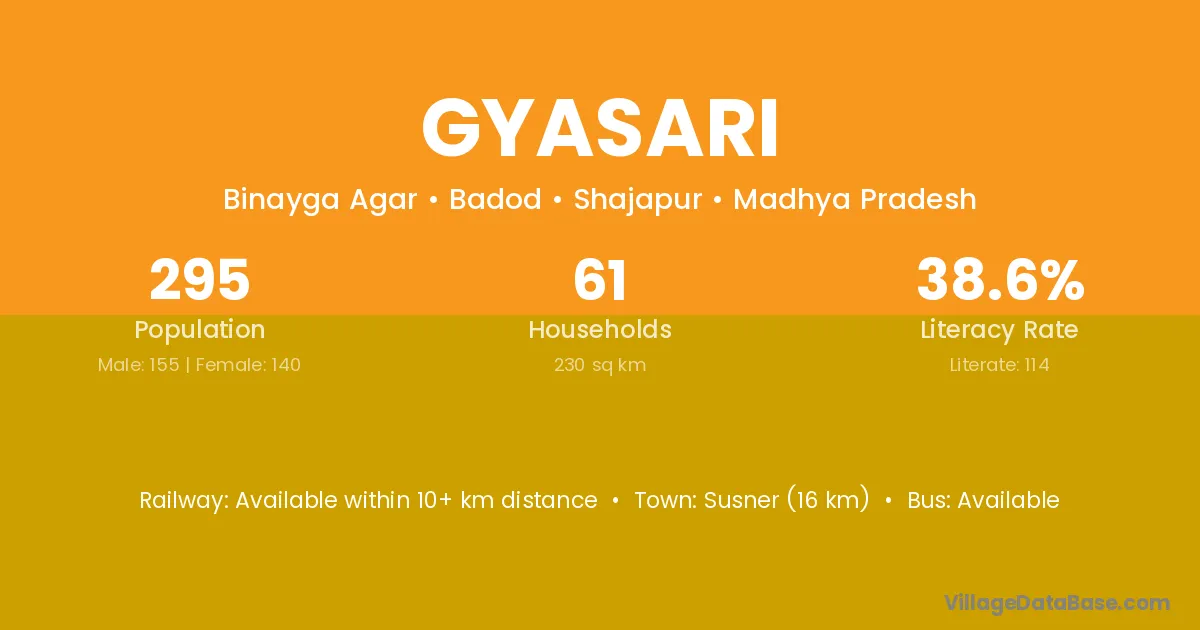Gyasari village has a total population of 295 people, of which 155 are males and 140 are females.