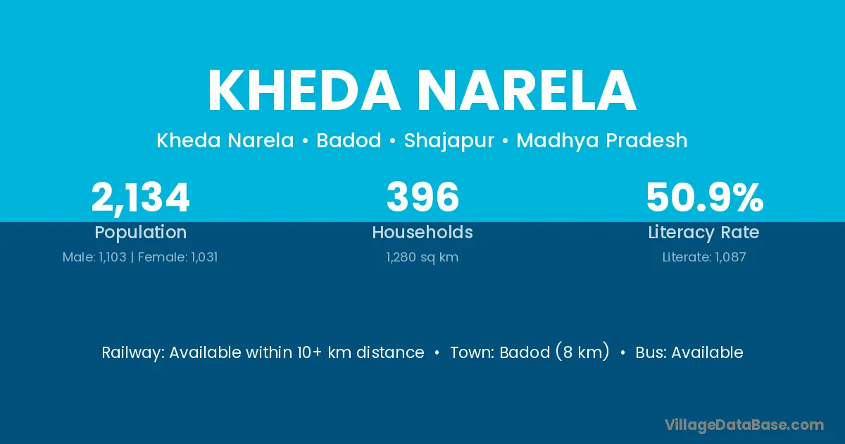 Badod (8 km) is the nearest town to Kheda Narela village for major economic activities and is located approximately 8 km away.