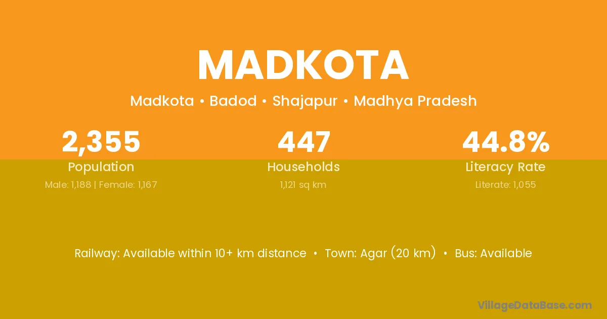 Agar (20 km) is the nearest town to Madkota village for major economic activities and is located approximately 20 km away.