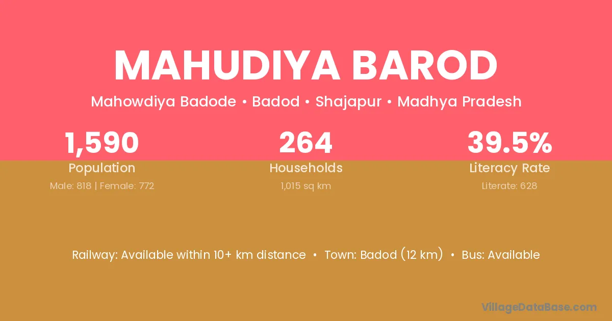 Badod (12 km) is the nearest town to Mahudiya Barod village for major economic activities and is located approximately 12 km away.