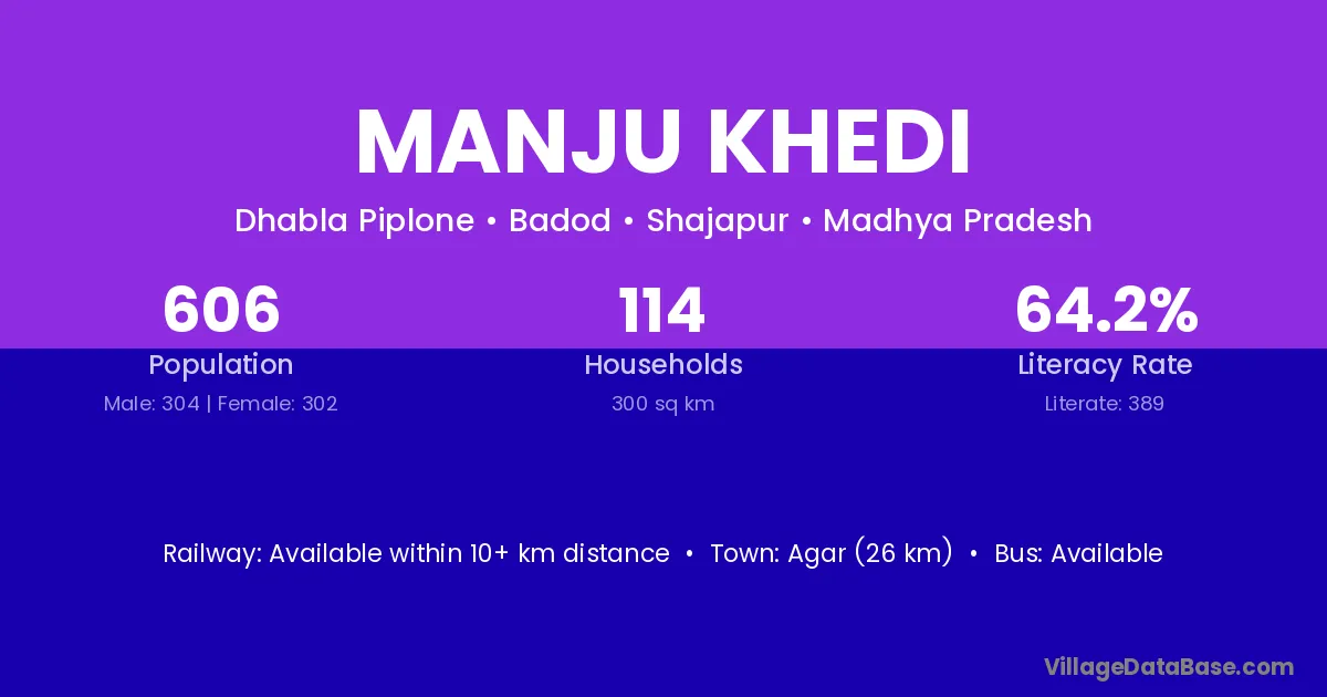 Agar (26 km) is the nearest town to Manju Khedi village for major economic activities and is located approximately 26 km away.